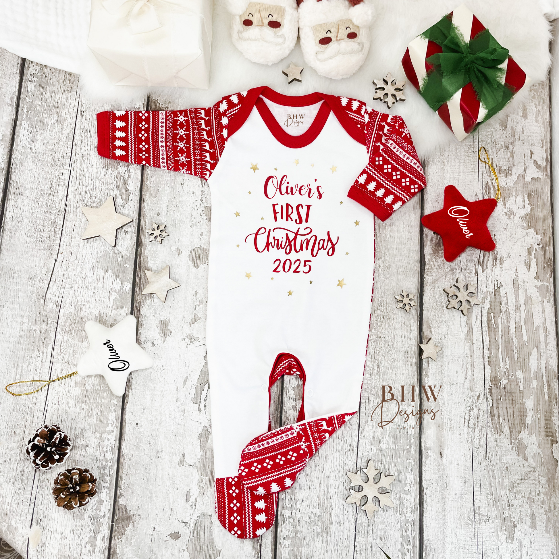 This adorable all-in-one features patterned sleeves, feet and back in a classic Fair Isle print, with a crisp white front panel personalised with your child’s name and “First Christmas 2025”. The festive red trim adds the perfect finishing touch, creating a cosy outfit for Christmas Eve, Christmas morning, or those treasured festive photos.