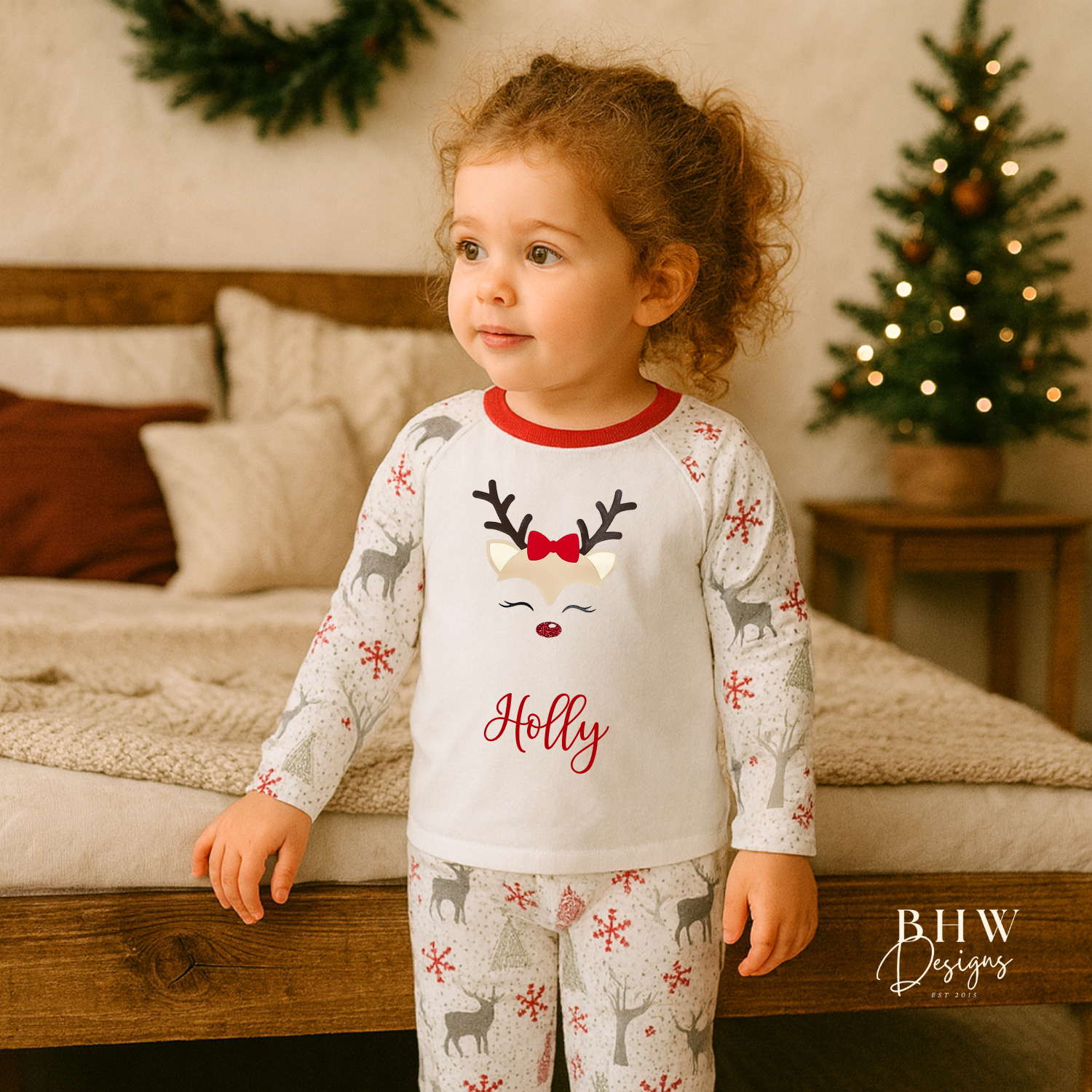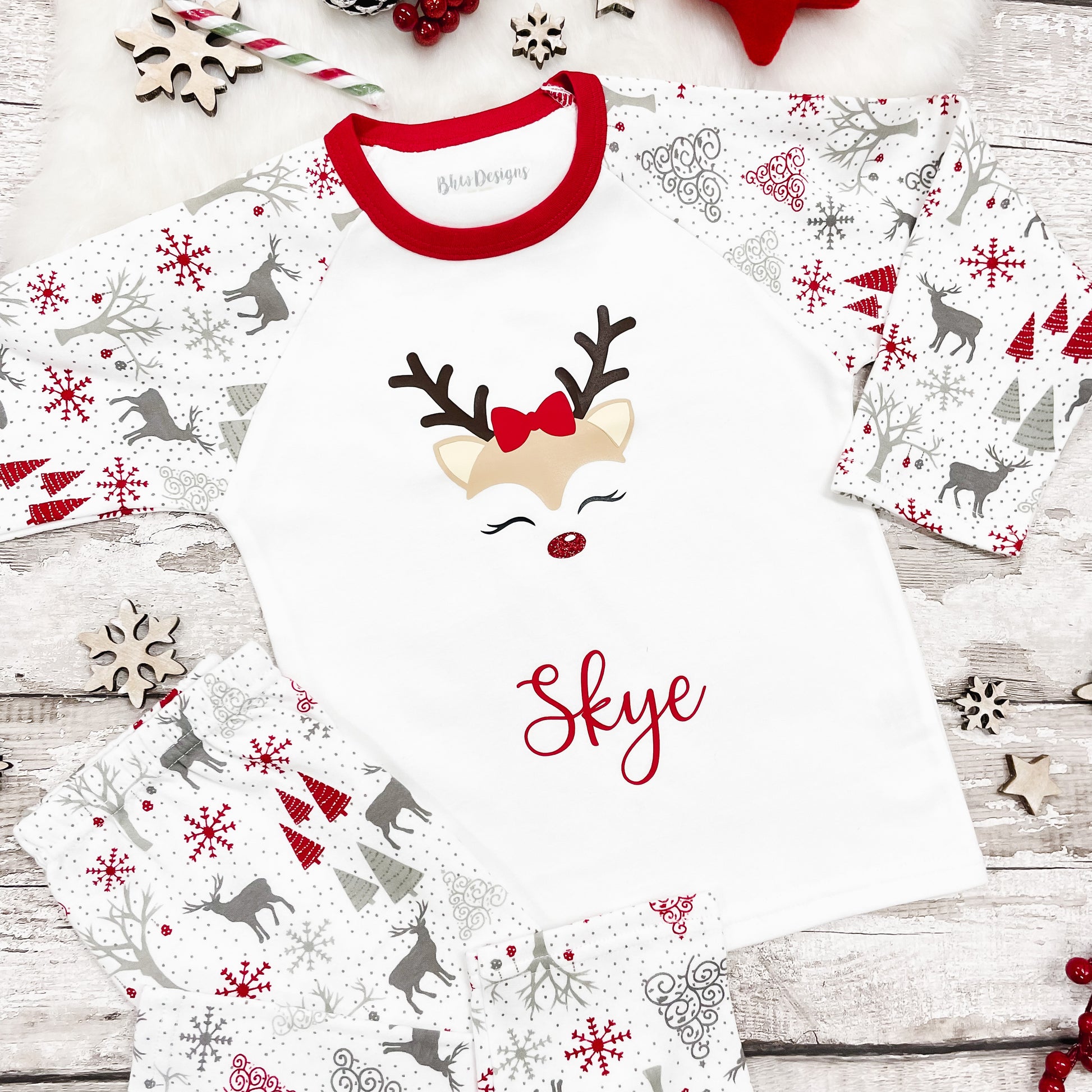 The Pj's come in soft white with a red and grey reindeer, Christmas tree and snowflake print to sleeves and pyjama bottoms. With Long sleeves for extra warmth on cooler nights. They have a hand designed reindeer motif on the front with a red bow, glitter red nose and finished off with the name in a Christmas red colour.