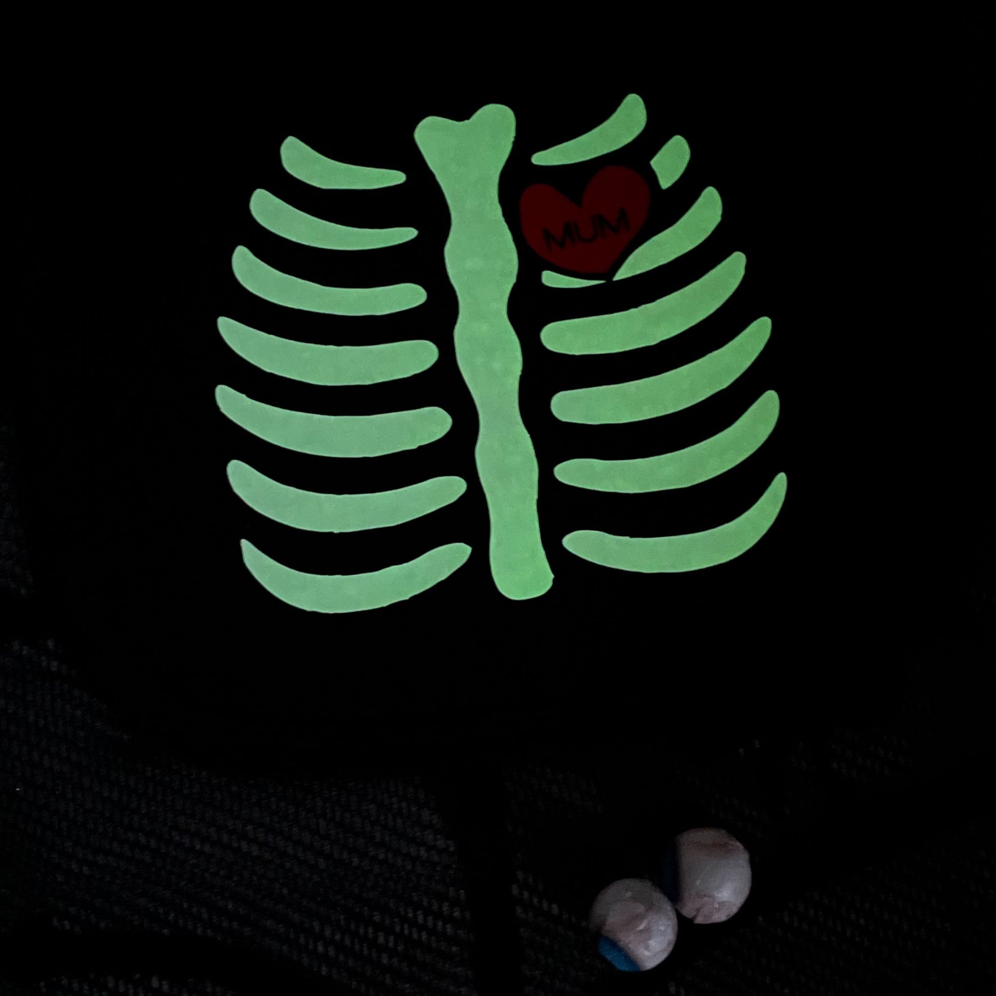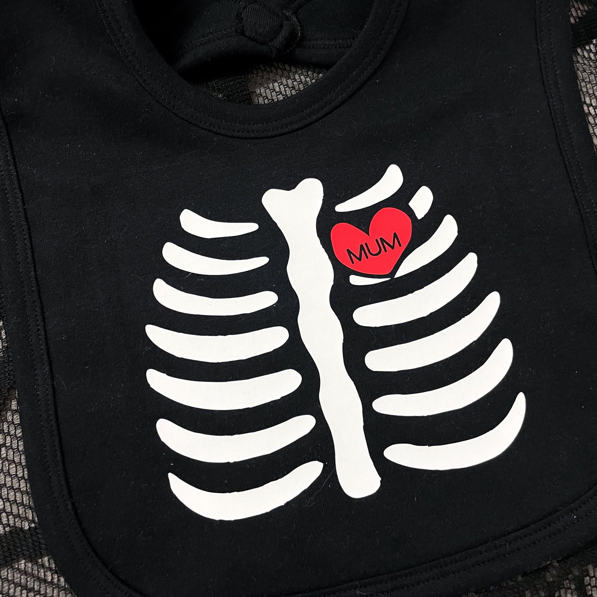 The bib has a hand designed skeleton rib motif on the front in white with a stunning glows in the dark feature with a red heart with the option of having a name in the heart.