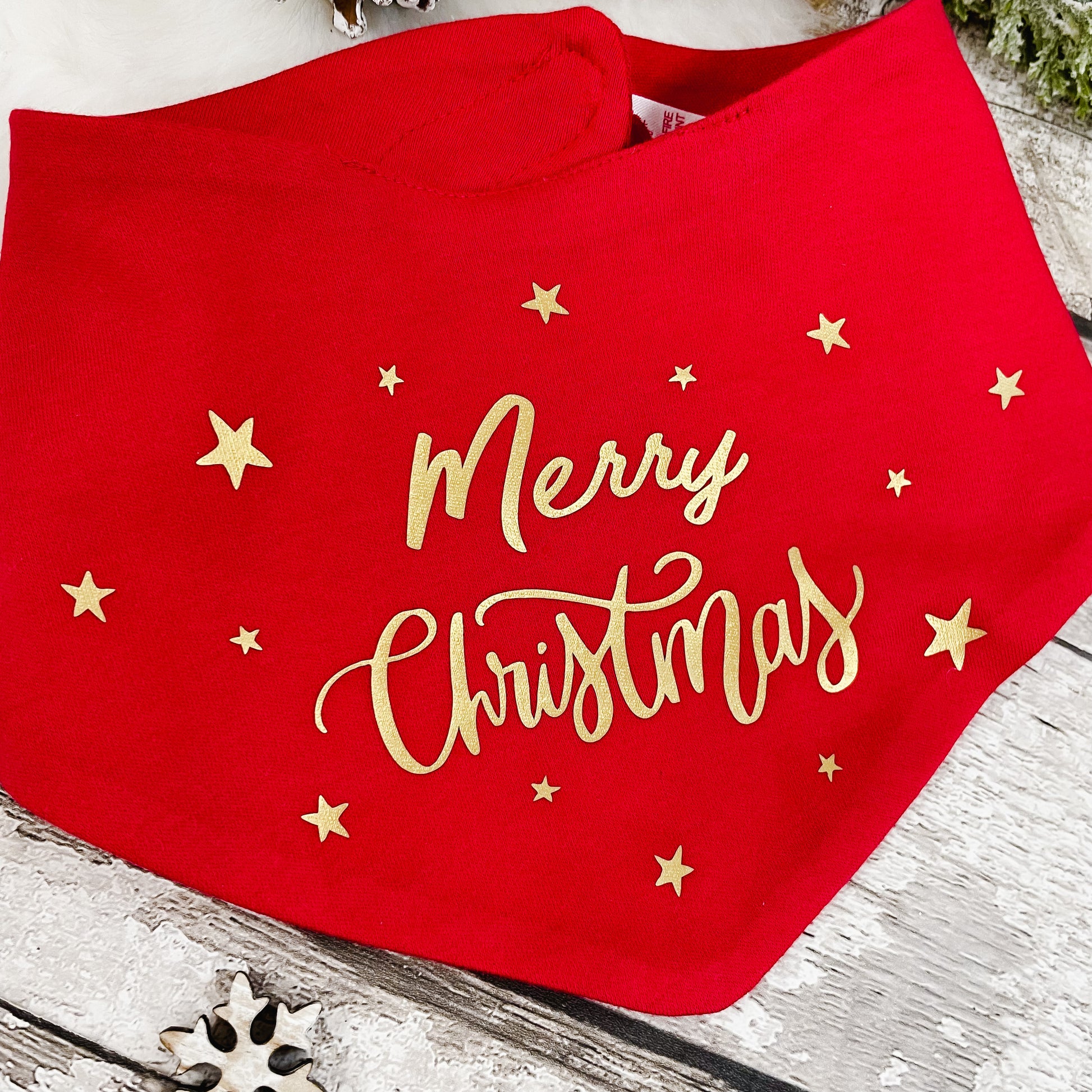 Add a touch of festive cheer to your little one’s outfit with our red bandana-style bib featuring a “Merry Christmas” design surrounded by a scattering of stars. Made from soft, double-layer cotton, this dribble bib is both stylish and practical, perfect for keeping little ones comfortable while looking adorable throughout the festive season.