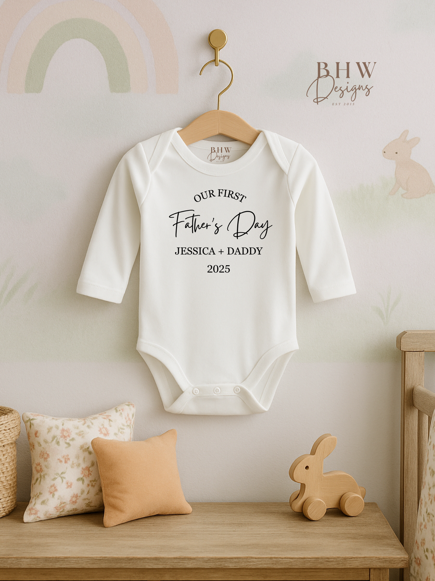 This Gorgeous soft cotton White Baby Bodysuit or vest has a beautiful Our first Father's Day motif on the front personalised with Daddy and your little ones name of choice with the year to make a perfect and truly unique Father's day gift.
