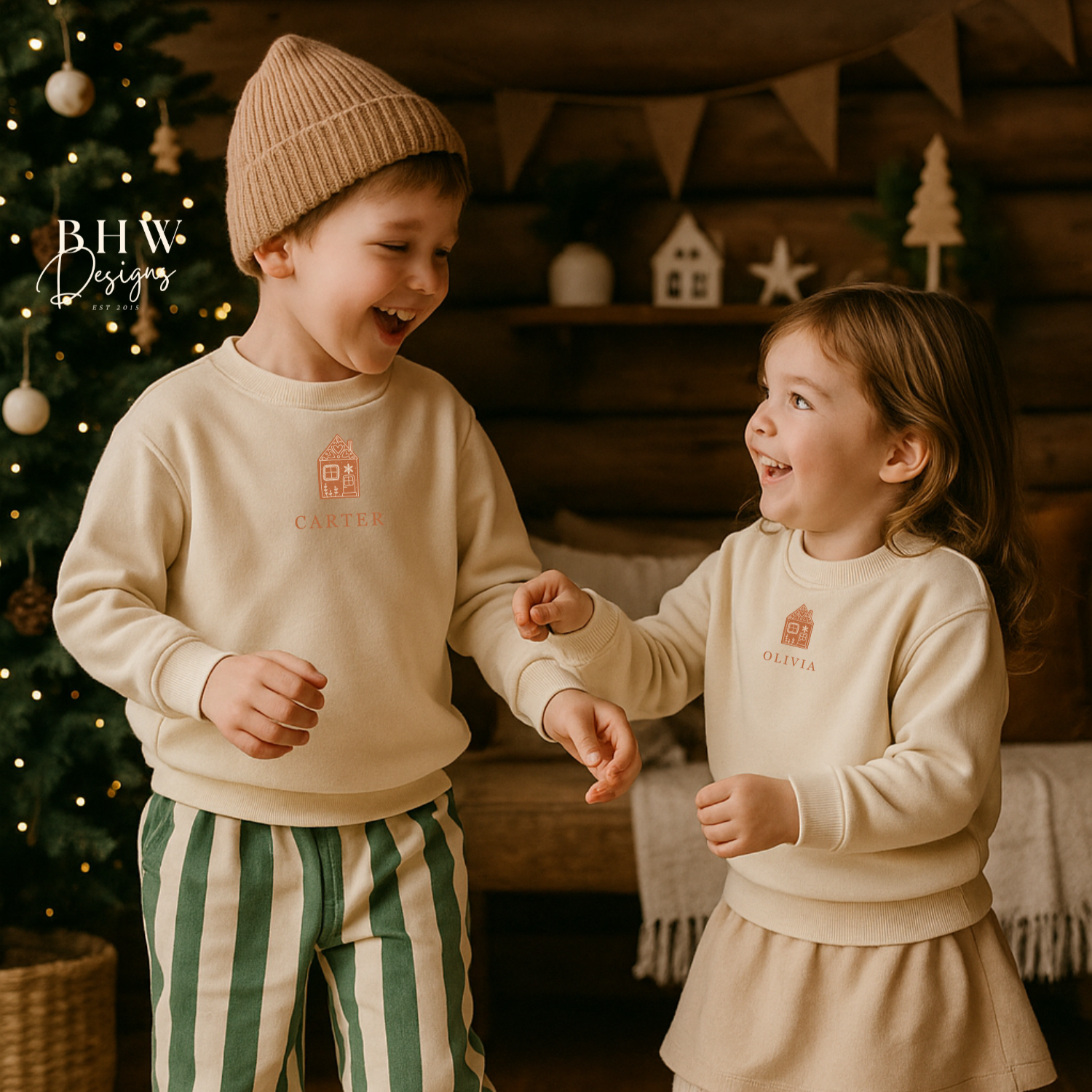 Our Crew neck sweatshirt is made with a twin needle stitch making it extra soft with a fleece lining. In a beautiful neutral colour with a red candy cane on the front, personalised with any name in a stand out modern font. The Sweatshirt has fine Knit Rib Cuffs and Hem to make them extra comfortable.