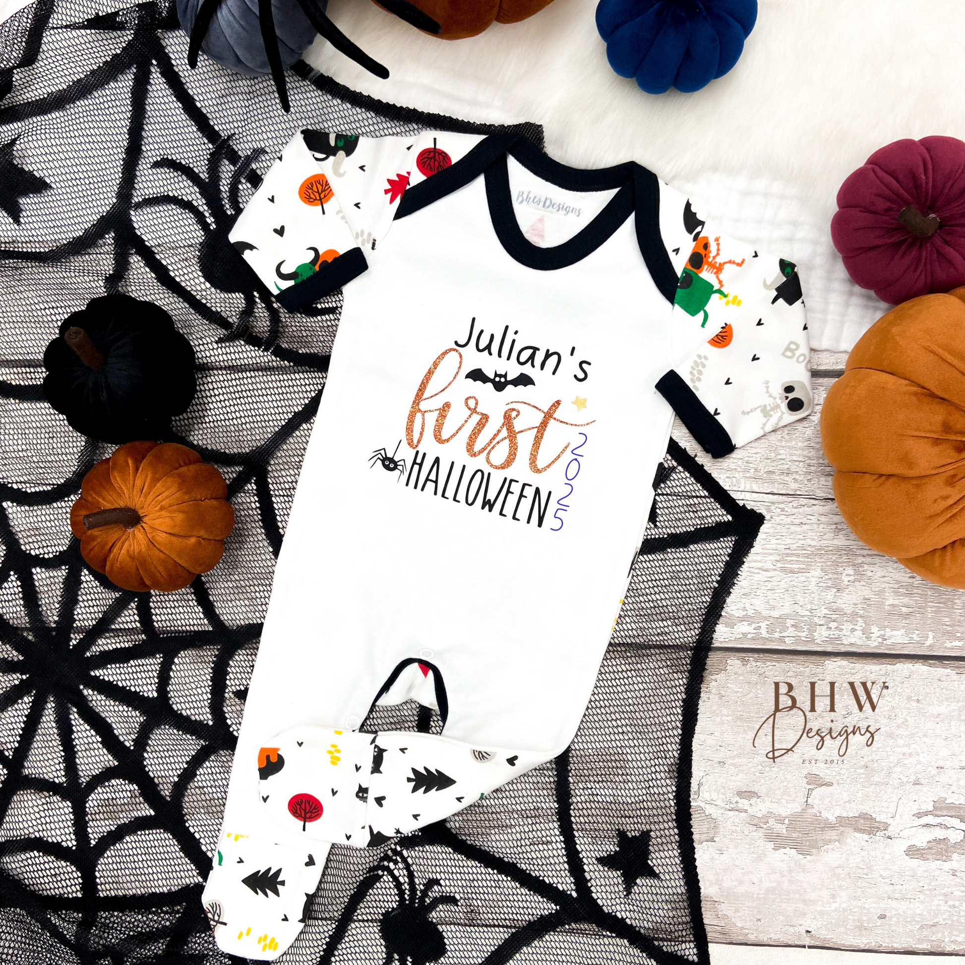 This soft white cotton Baby Bodysuit comes with a multi colour Halloween print to the back, sleeves and feet. With an original hand designed Personalised First Halloween Motif on the front in a mixture of Glitter Orange, Black, Purple and Gold with bat and spider details with the year 2025 along the side. The Bodysuits has long sleeves with a black trim and nickel free poppers opening.