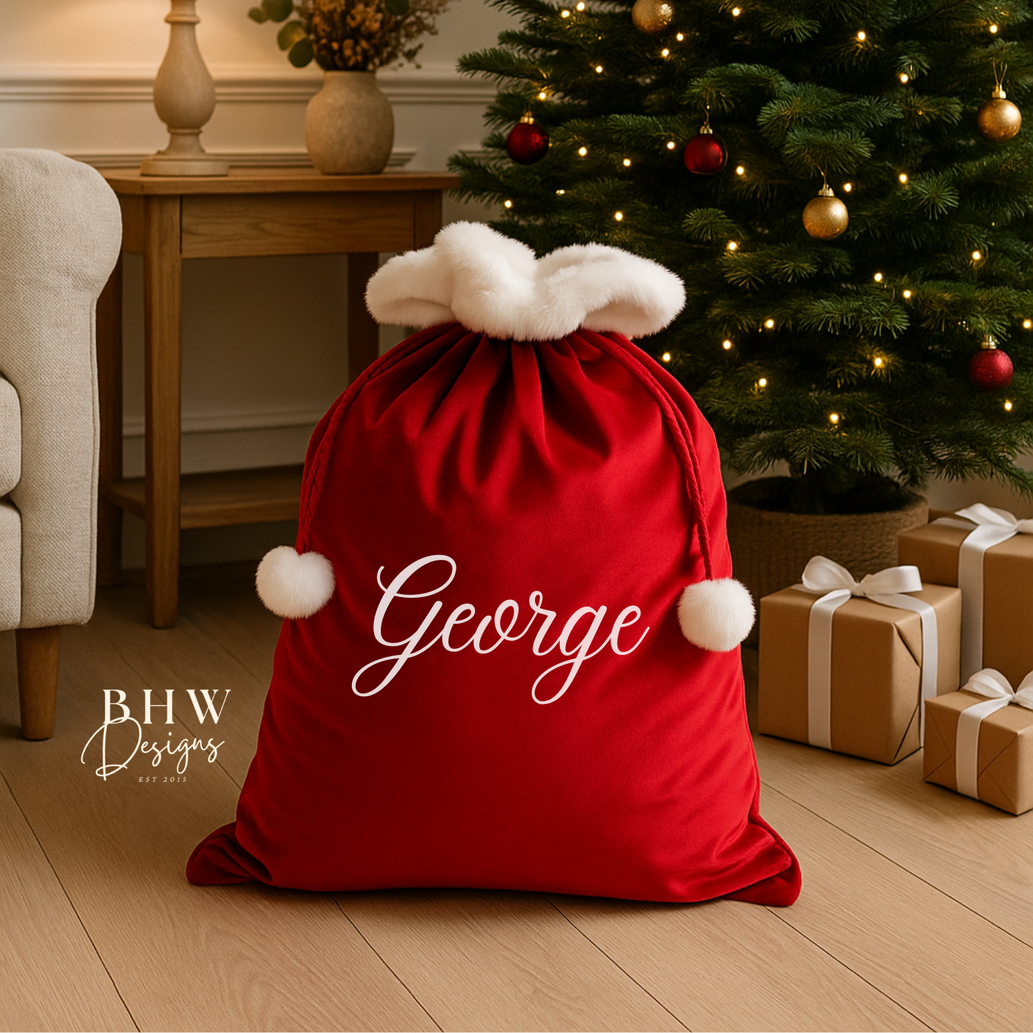 The sack is finished off with a personalised name on the front chosen from a selection of colours in a Script style font for an extra Christmas feel.