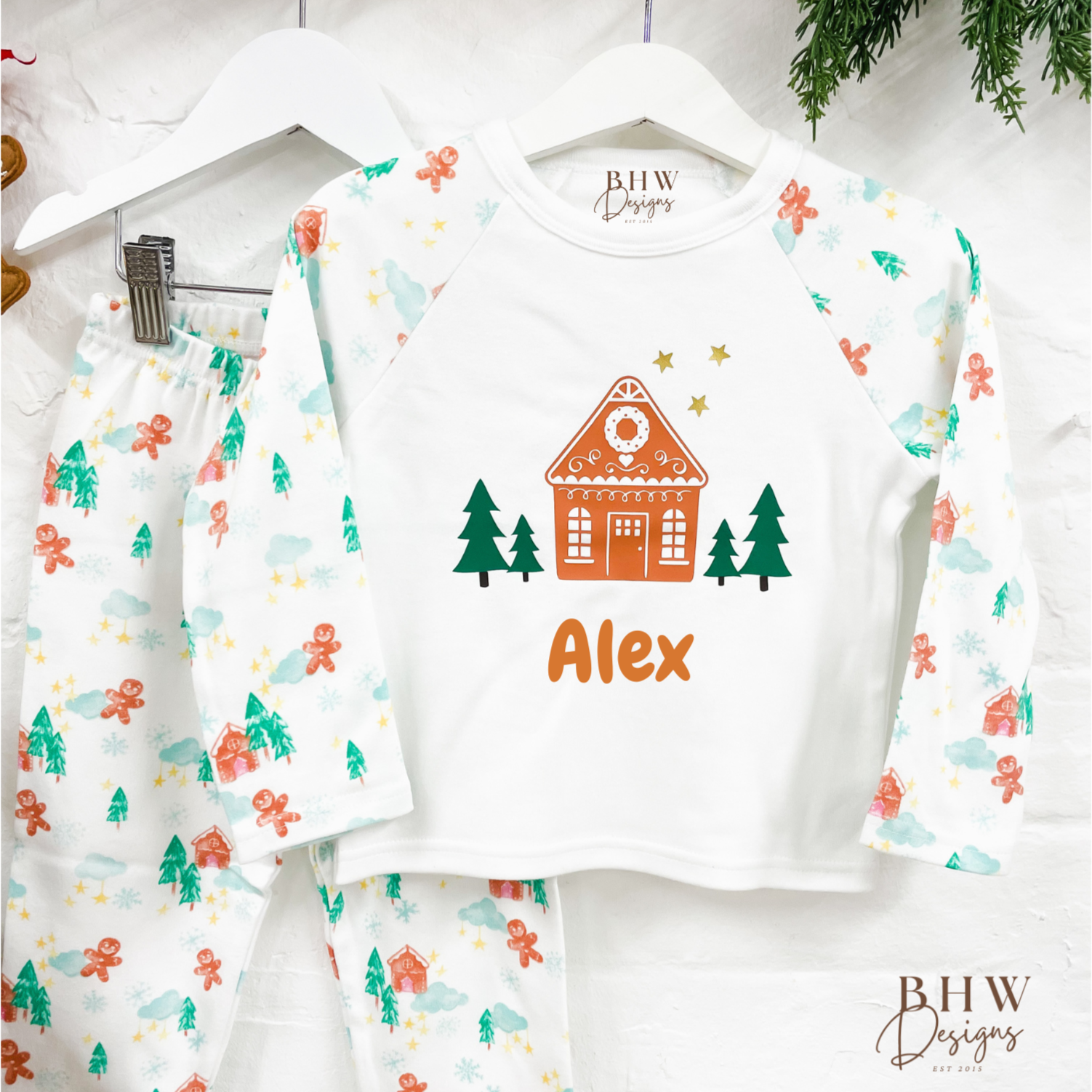 These Children’s Pyjamas come in soft white with a Gingerbread man, tree, gingerbread house and star print to the sleeve and bottoms. With Long sleeves for extra warmth on cooler winter nights. The pyjamas have an original hand designed Gingerbread house on the front with green trees, personalised with your littles one's name finished off with gold stars.
