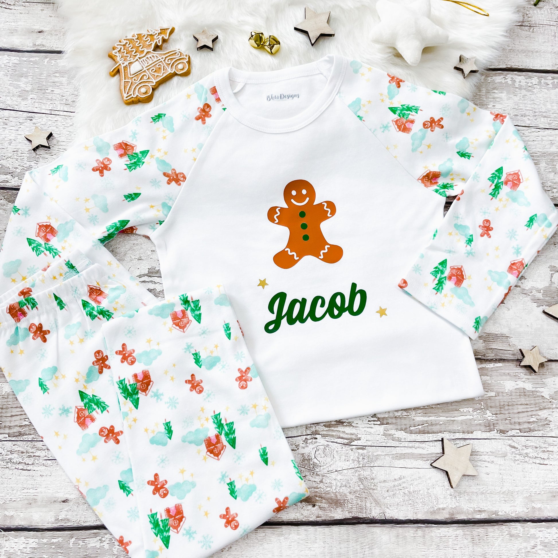 These Children’s Pyjamas come in soft white with a Gingerbread man, tree, gingerbread house and star print to the sleeve and bottoms. With Long sleeves for extra warmth on cooler winter nights. The pyjamas have an original hand designed Gingerbread man on the front with green buttons, personalised with your littles ones name in Green and finished off with gold stars.