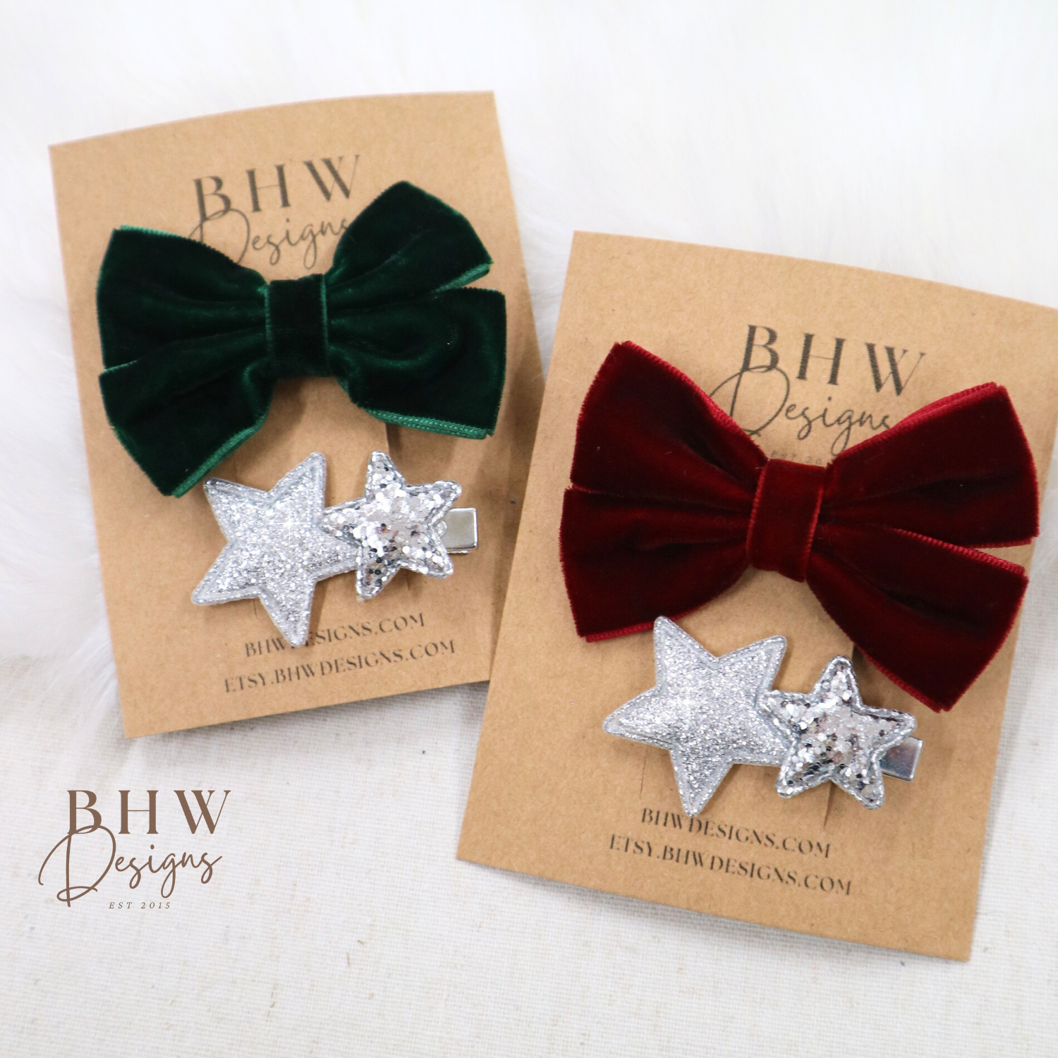 Add a touch of festive sparkle with our Velvet Bow & Silver Star Hair Clip Set, available in rich red or deep green. Each set includes a luxurious velvet bow clip paired with a shimmering silver glitter star clip for a perfectly coordinated Christmas look.