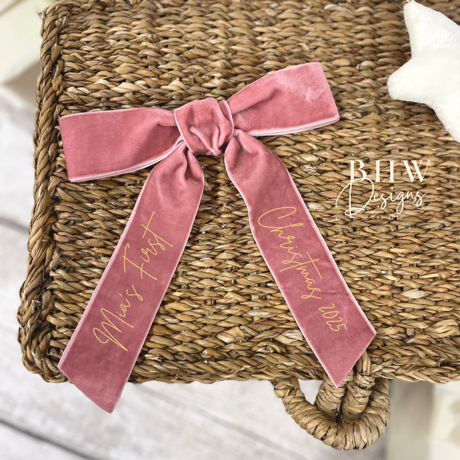 This beautiful handmade bow is the perfect keepsake to celebrate a little one’s first Christmas. Crafted in a soft dusky pink velvet, it features elegant lettering that reads “First Christmas 2025” along with your chosen name for a truly personal touch.